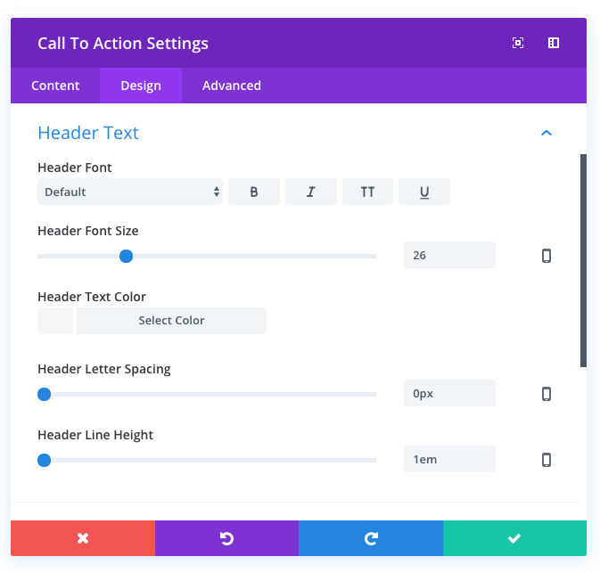 From within this tab you can do just about anything. Settings will vary depending on the type of module you are editing. Typically you will find options to adjust typography (such as text size, letter spacing, line height, etc), spacing adjustments (such as custom padding and margin values), color options (such as text color, overlay color, column background colors) as well as a slew of unique settings for certain elements. Utilizing these design options can create some truly unique.