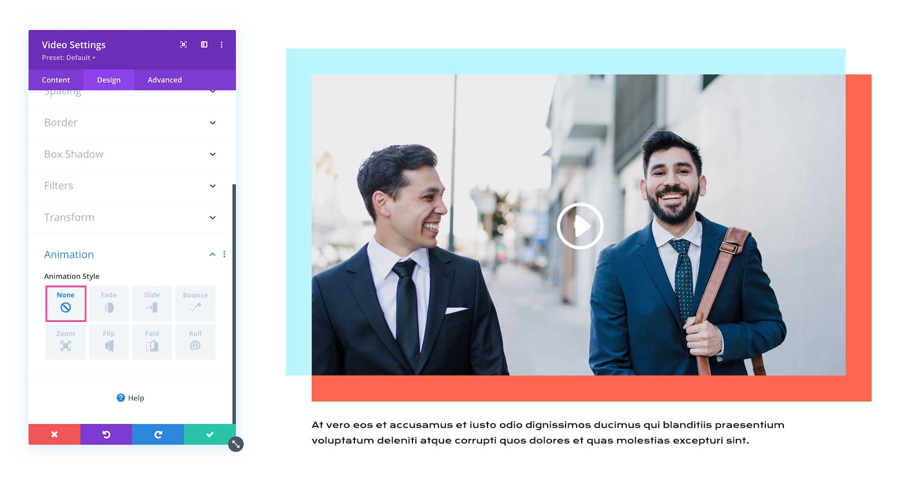 Animation options are available within all sections, rows, and modules. Simply open up the element’s settings, then navigate to Design > Animation.