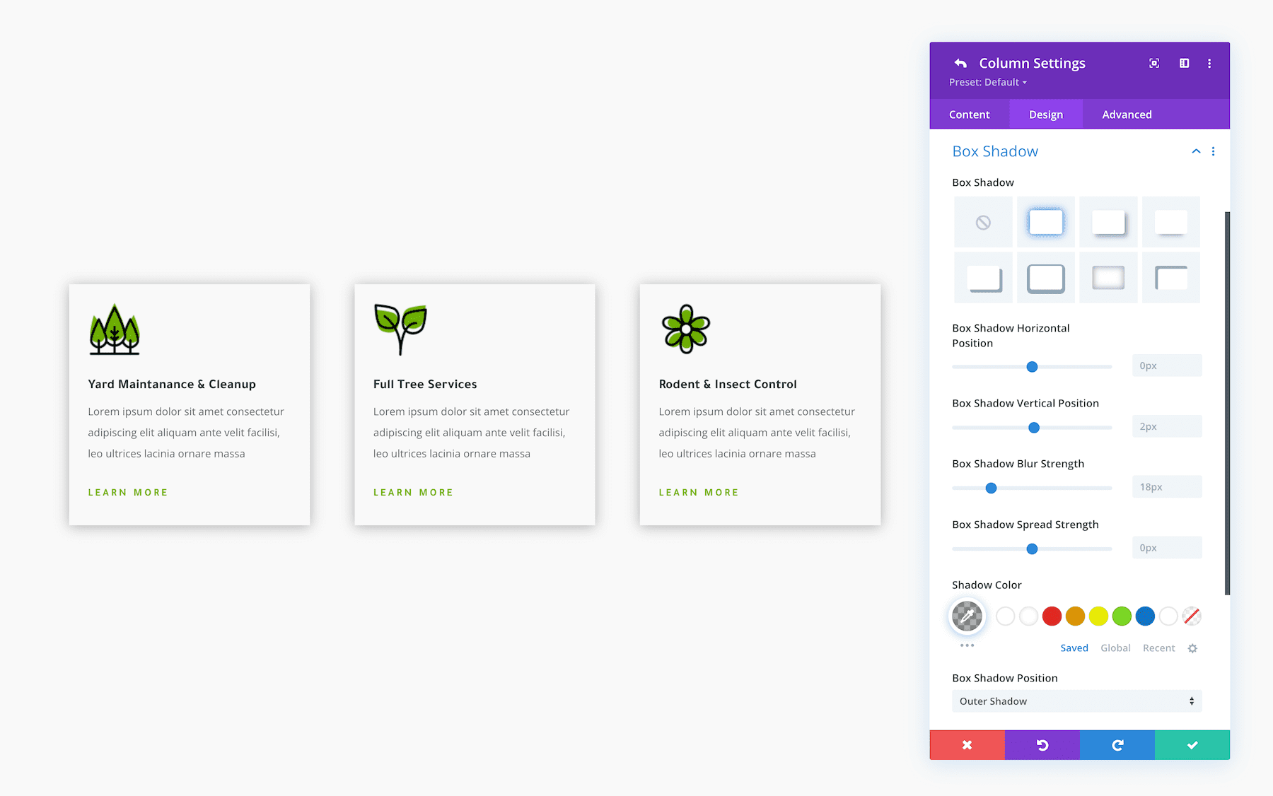 In general, when you’re using a box shadow to illustrator depth, use a subtle low opacity color. You can lower the opacity of any shadow color using Divi’s built-in color management system.