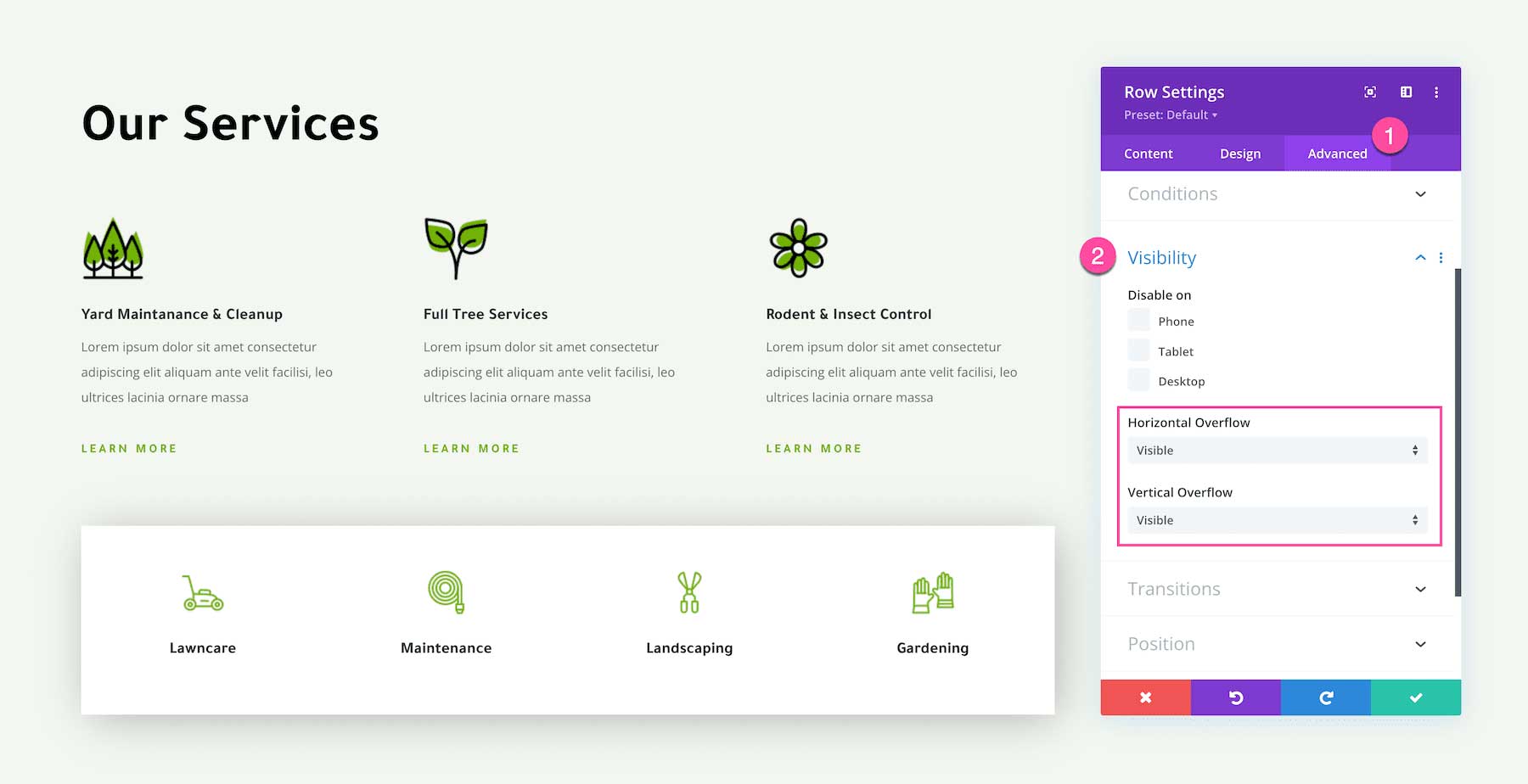 In some instances, you may not be able to see the outer box shadow of an element. If this is the case, in Advanced > Visibility, make sure the horizontal and vertical overflows are set to “visible” when you have a box shadow with an outer shadow. Otherwise, they will be hidden.