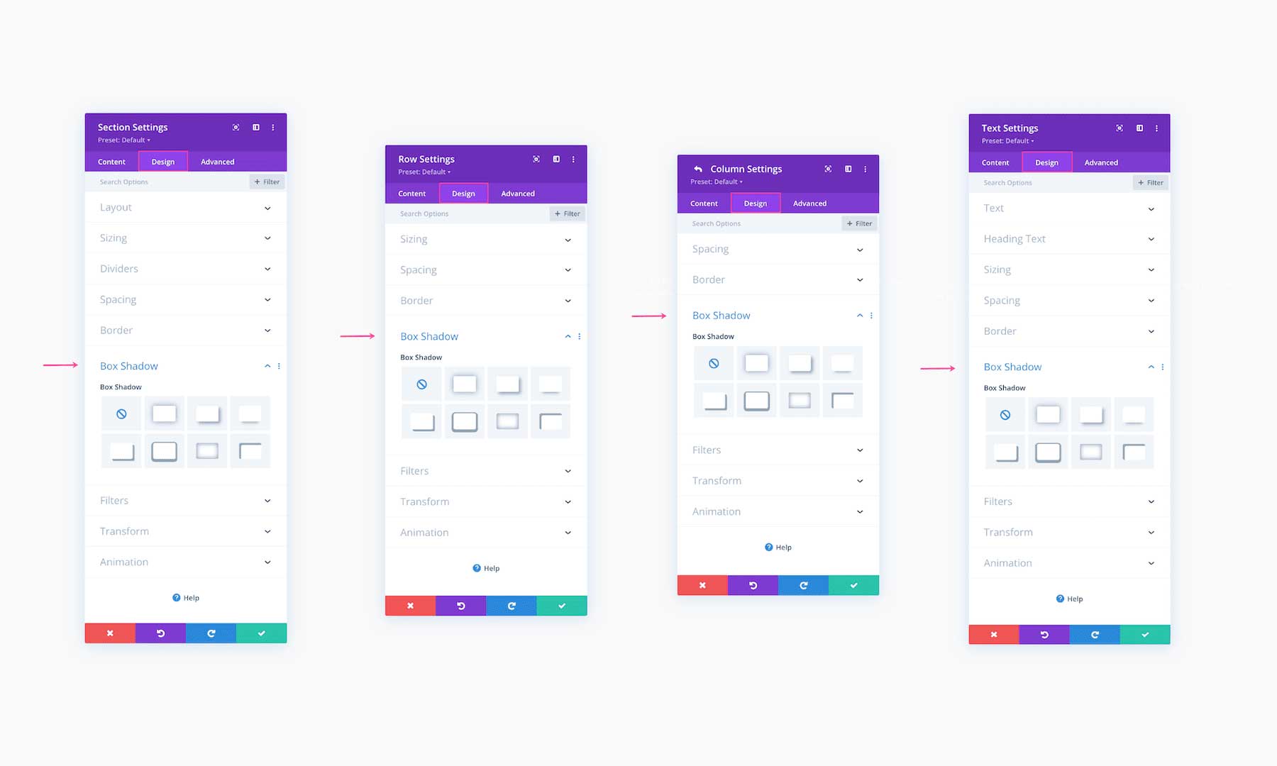 Box Shadow settings are always located under the Design tab in any section, row, column, or module you are working on. Navigate to the Box Shadow settings group and click to expand the options.