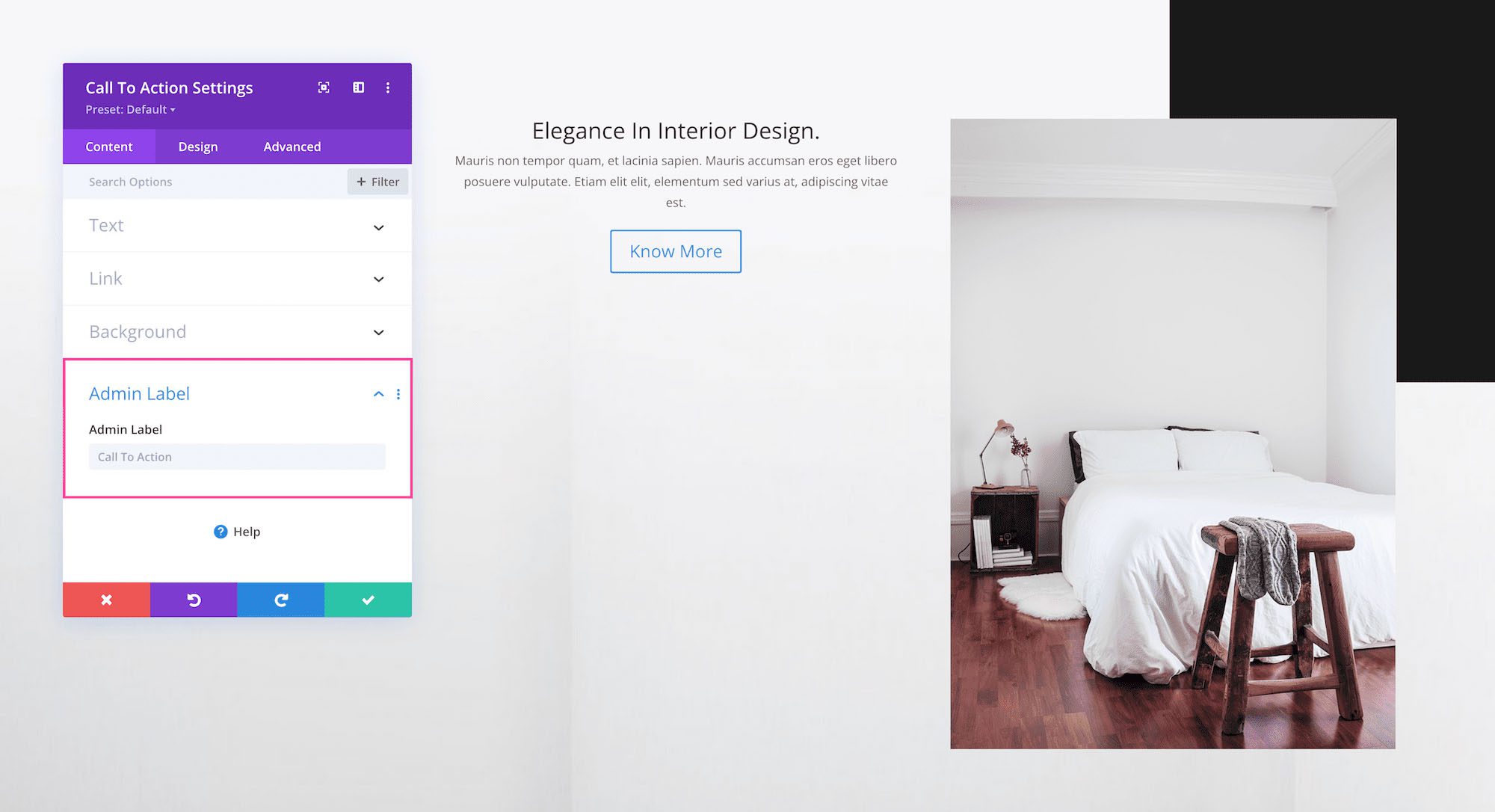 The Admin Label is where you can give the module a name only visible to you in order to assist in keeping things organized and easy to understand on the back end. By default, the admin label will be the name of the module. You can change the text of the admin label to reflect what you’d like.