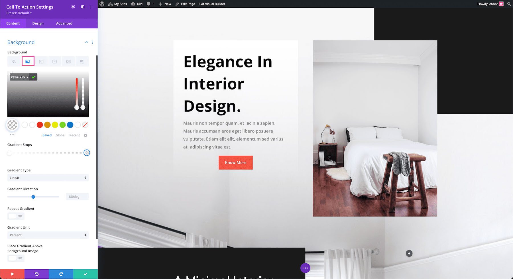 To change the gradient colors, click on the gradient stops and select a color from your site’s color palette or use the eyedropper icon to choose a new color. Gradient stops allow you to add more colors to the gradient. Simply click anywhere on the range slider to add a new stop.