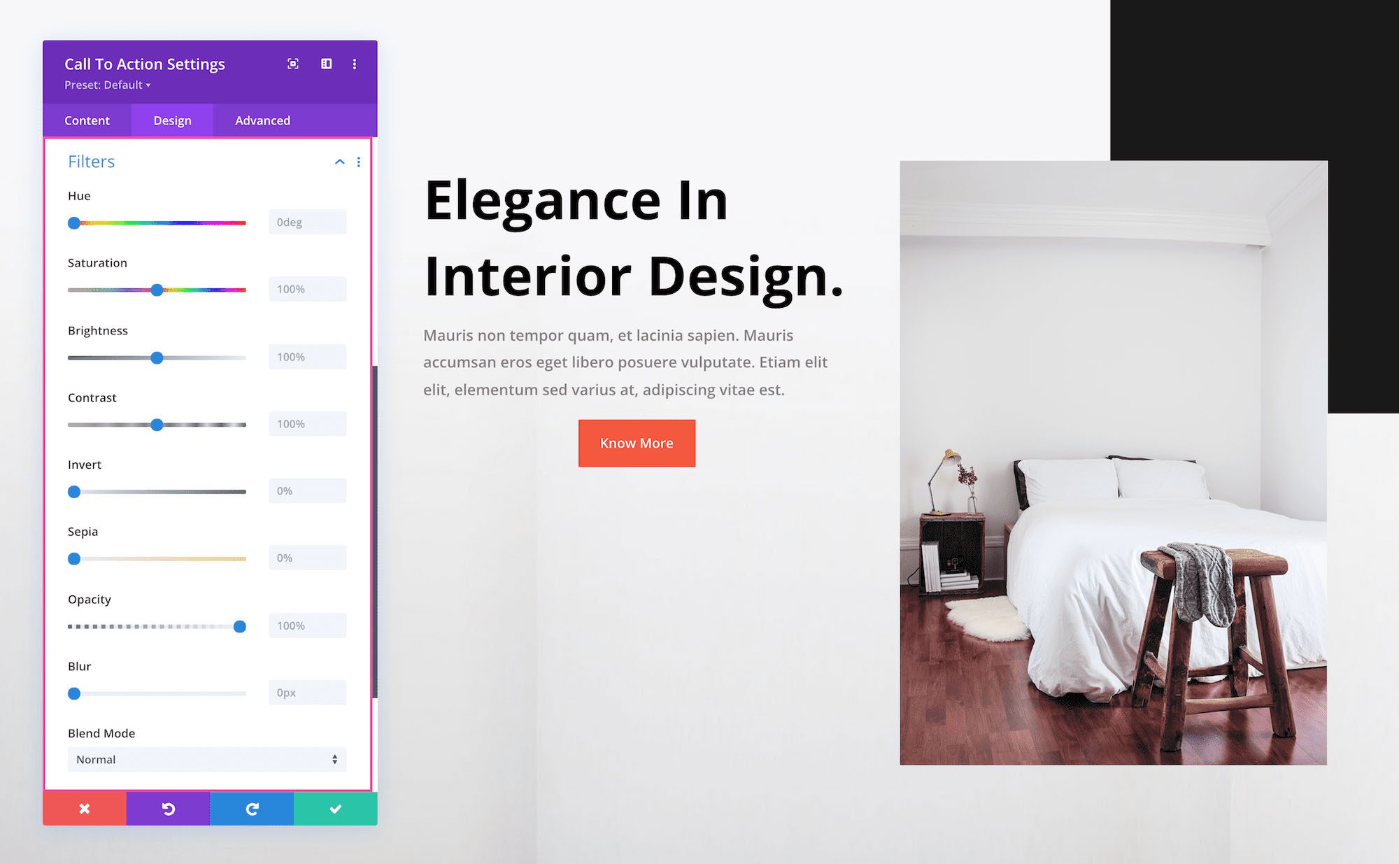Adjust the hue, saturation, brightness, contrast, color tones (inverted colors or sepia), opacity, and blur of this module. The Blend Mode refers to how the module blends with the layers beneath it. By default, “normal” will be selected.