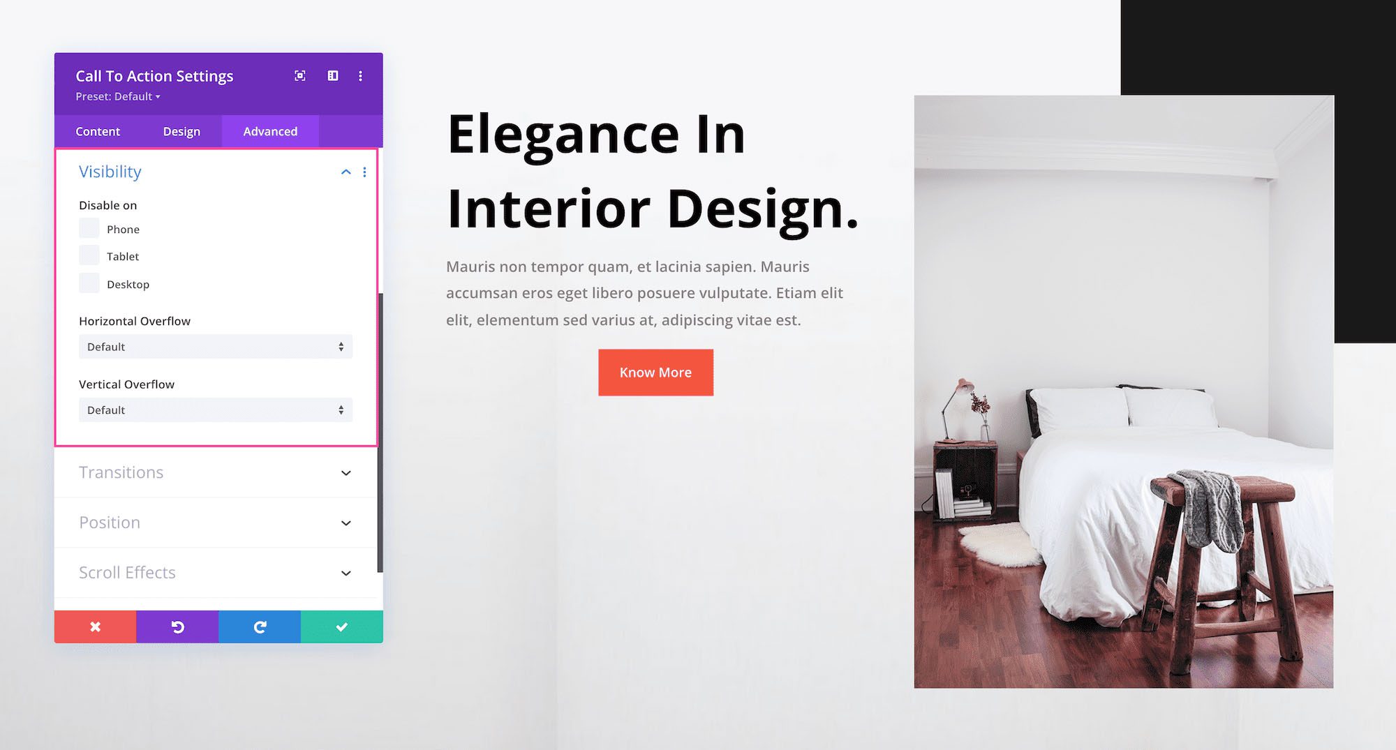 This defines the visibility of the module. You can choose to disable it (hide it from view) when the display window is a Phone, Tablet, or Desktop by clicking the corresponding checkbox. You can also determine how you want overflow content to be displayed if the content overflows the element that it is in. You can choose visible, scroll, hidden, or auto for both horizontal and vertical content. By default, “auto” is selected.