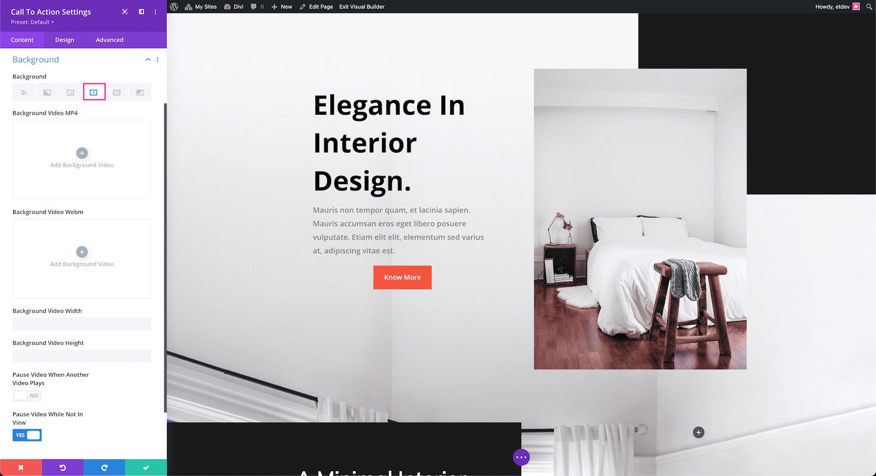 - Pause Video When Another Video Plays – If you’d like the background video to pause when another video is playing, toggle that option to “yes.” By default, the video will pause when not in view. If you’d like the video to continue playing, toggle this option to “no.”
