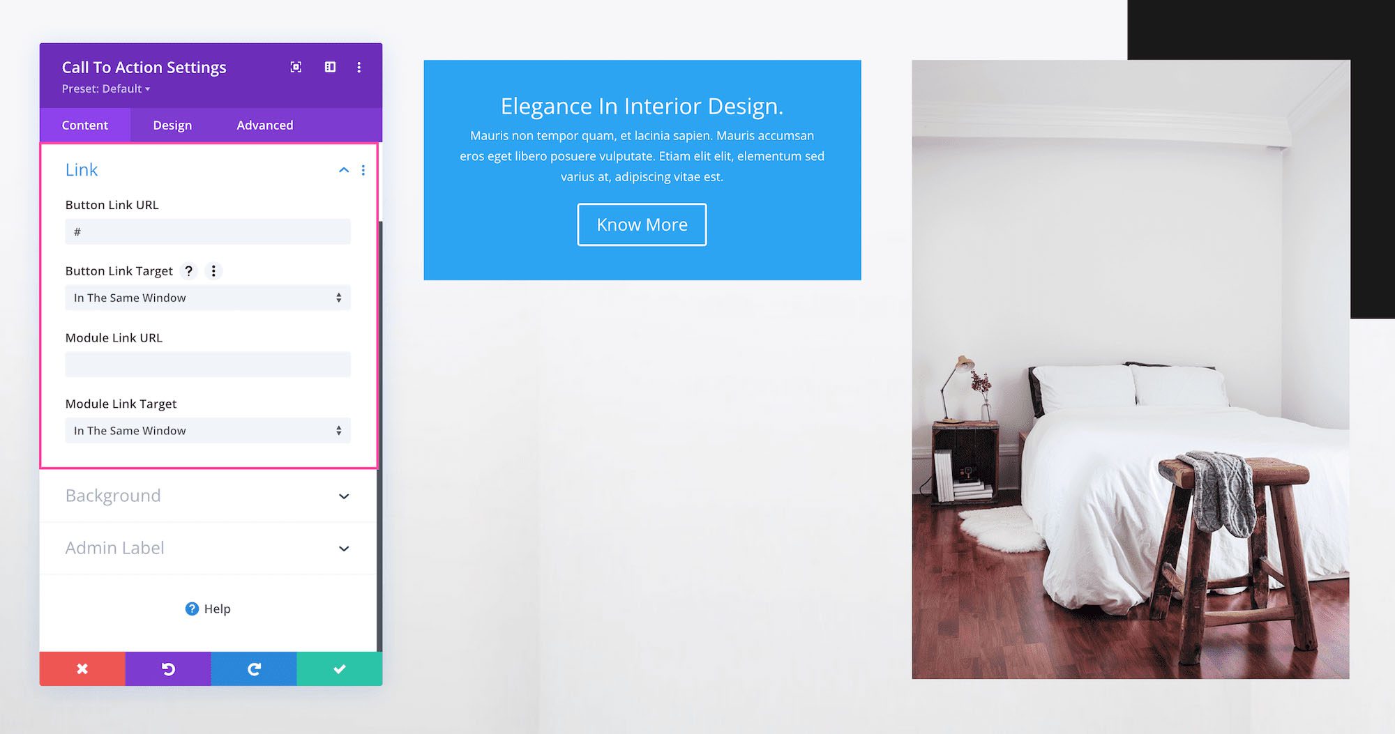 Once you’ve added the Divi Call To Action module, the module settings automatically pop up. This is where all of the content and design styles for this module are configured. These settings are organized into three groups via the tabs at the top of the module: Content, Design, and Advanced.