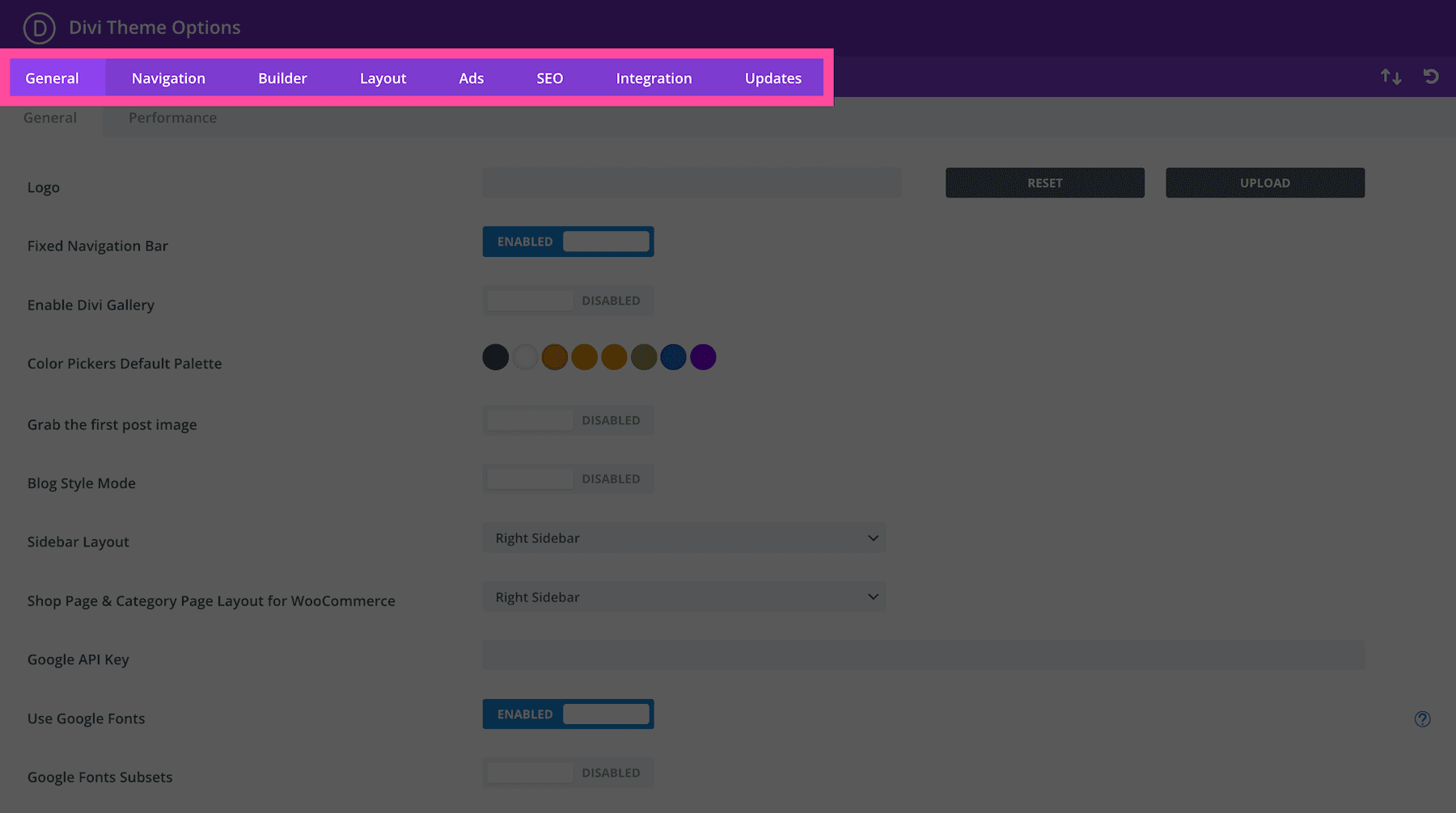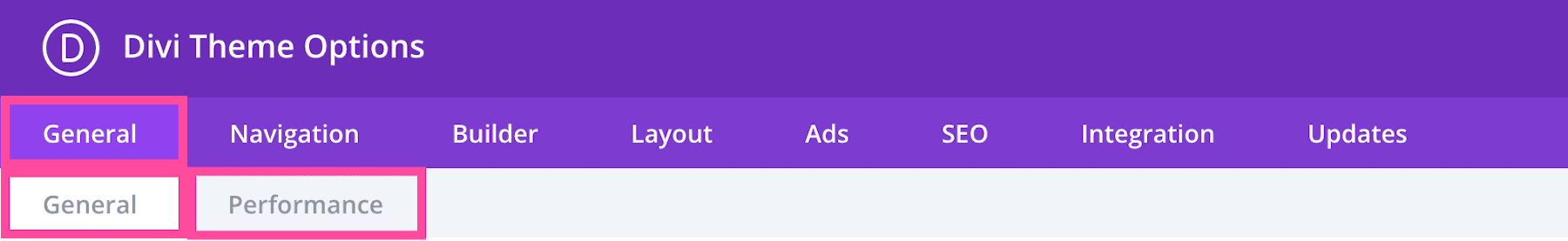 This is where the general settings for Divi’s Theme Options live. Here you’ll find two sub-tabs: General and Performance.