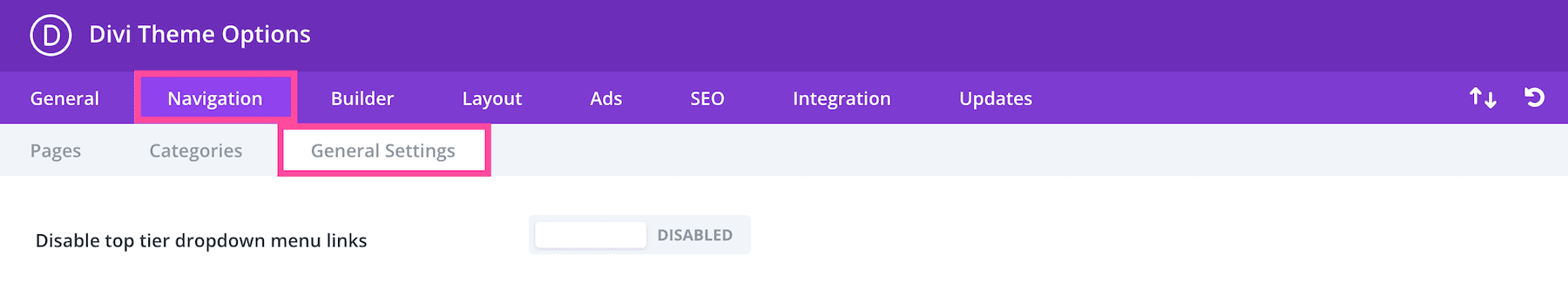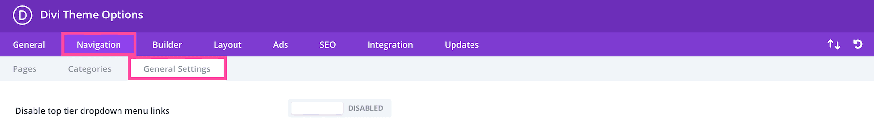 In the General Settings sub-tab, you’ll find a setting for disabling top tier dropdown menu links.