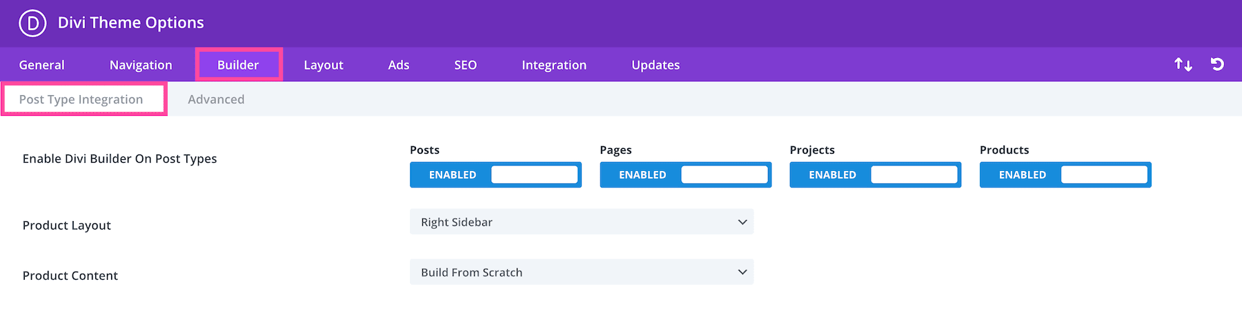 In the Post Type Integration sub-tab, you’ll see the setting Enable Divi Builder On Post Types, Product Layout, and Product Content.
