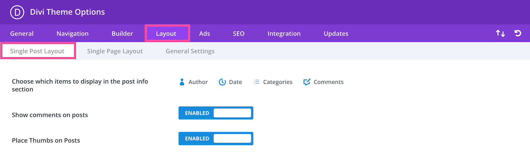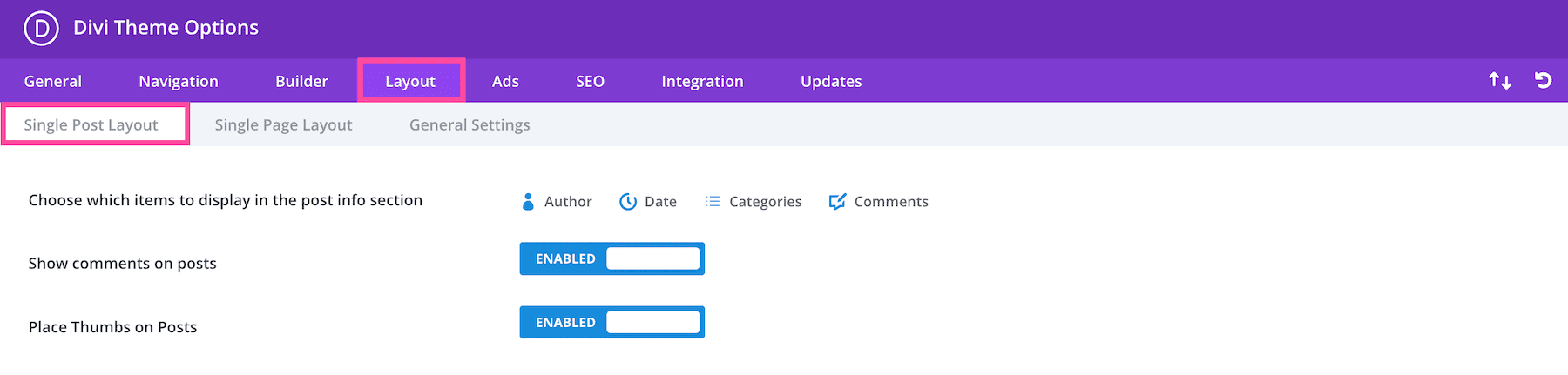 In the Single Post Layout sub-tab, you’ll see the settings for choosing what information to display in the post info section, showing or hiding comments on posts, and placing thumbnails on posts.
