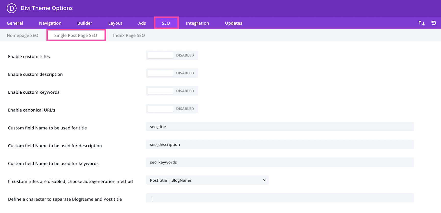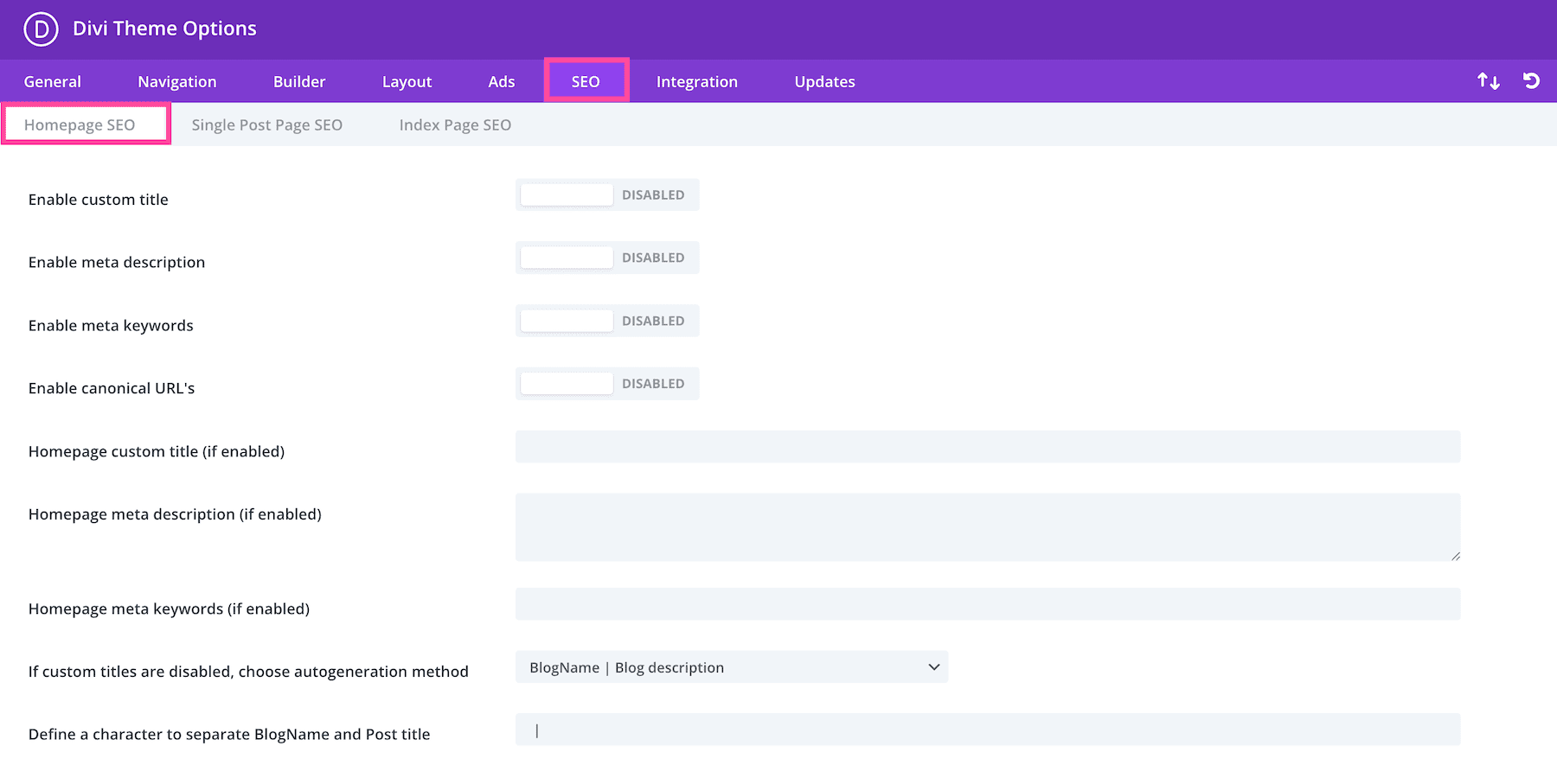 In the SEO tab, you’ll find three sub-tabs: Homepage SEO, Single Post SEO, and Index Page SEO.