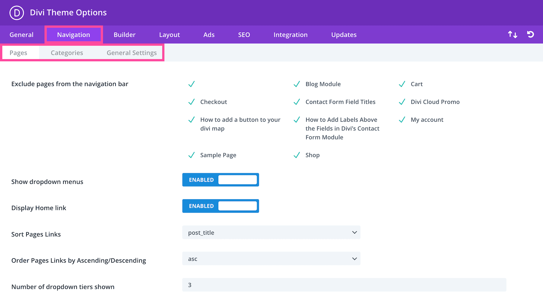 In the Navigation tab, you’ll see three sub-tabs: Pages, Categories, and General Settings.