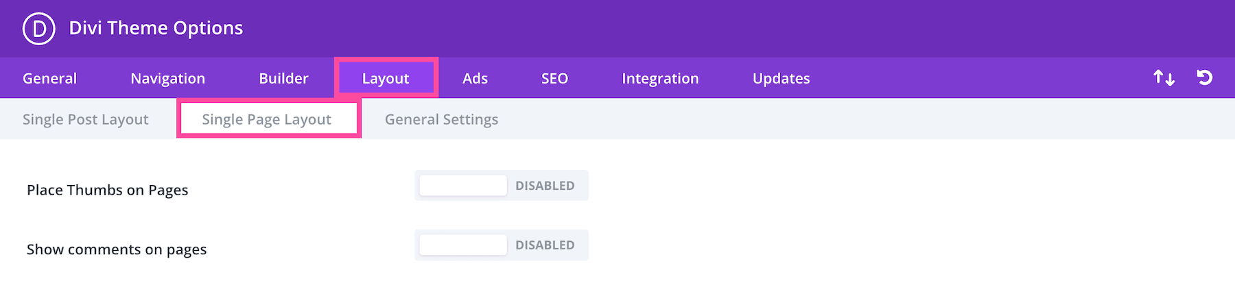 In the Layout tab, you’ll see three sub-tabs: Single Post Layout, Single Page Layout, and General Settings.