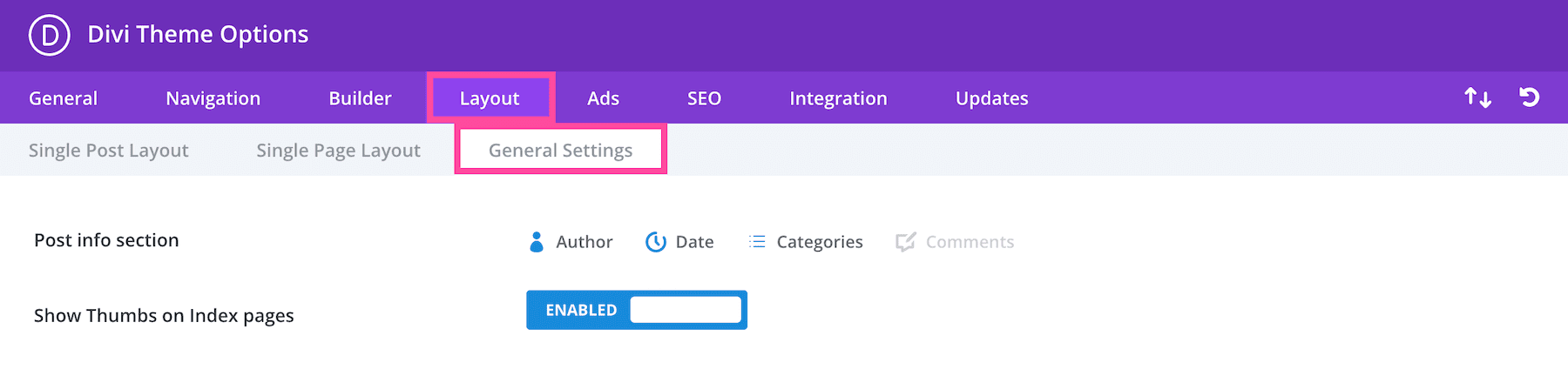 In the General Settings sub-tab, you’ll find settings for post info section, and showing or hiding thumbs on index pages.