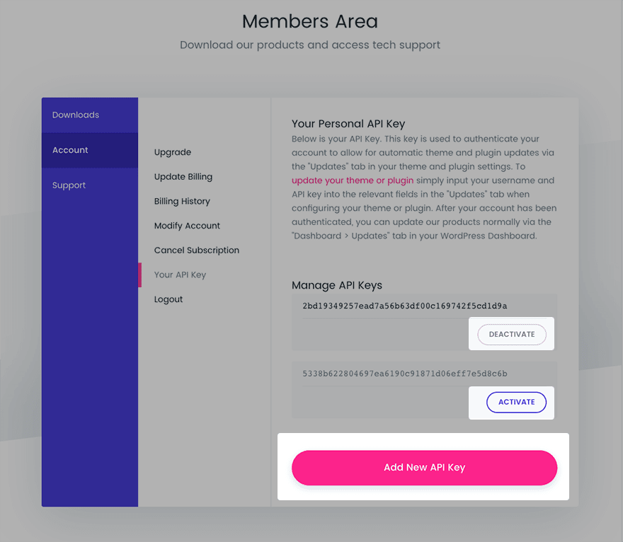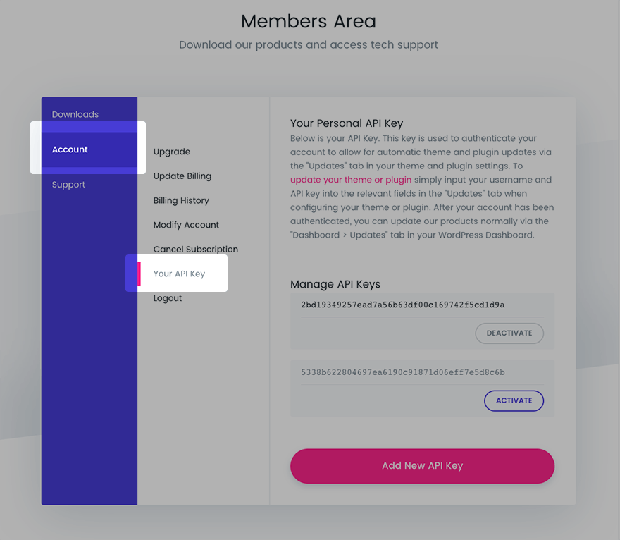 Before you can update your theme or plugin, you must first authenticate your Elegant Themes subscription. Only members with active accounts have access to product updates. To authenticate your account, you will be asked to input two pieces of information into your theme or plugin settings panel: 1) Your Username and 2) Your API Key. Your username is the same username you use when logging in to your ElegantThemes.com account, and your API Key is a unique identifier used to authenticate your account that is only available to you when logging in. To locate your API Key, log in to the Elegant Themes members area and click on the Account > Your API Key link. Copy the API Key displayed on the page. You will by pasting this key into your Theme or Plugin options page.
