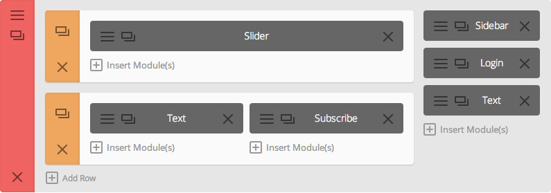 Specialty sections allow for the most diverse column structures and can be used to create truly dynamic page layouts. Theses sections are represented by red handles in the builder