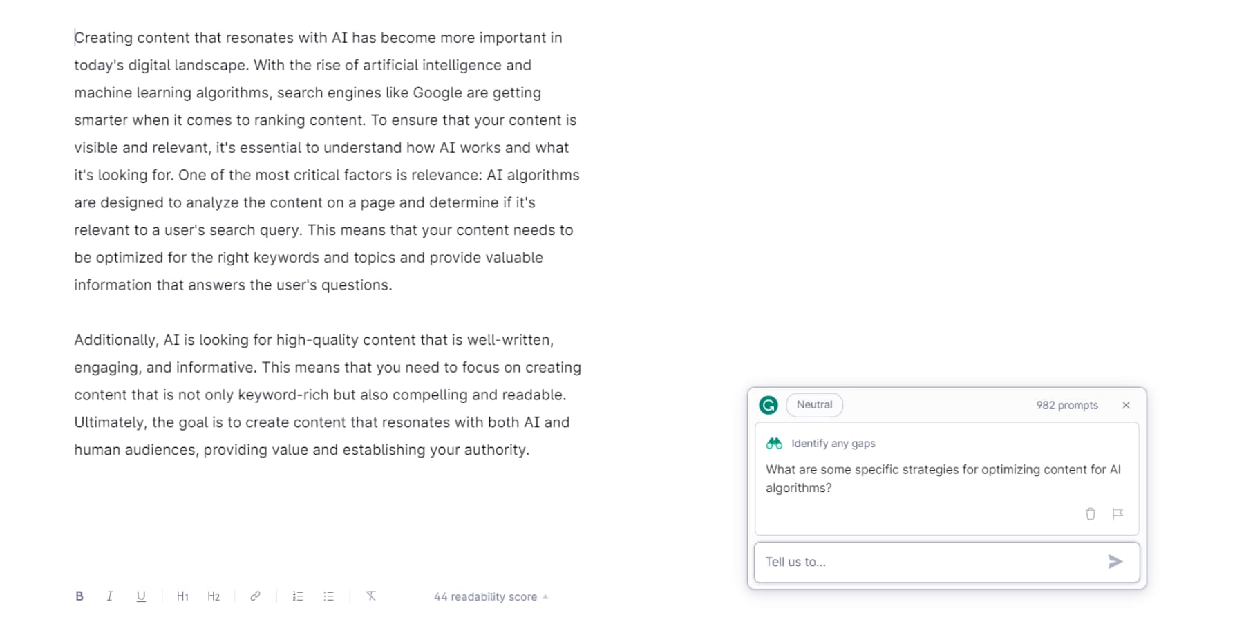 GrammarlyGO doesn’t only help you identify gaps but can actively help you improve your writing in many ways. It can help you make your writing clearer, concise, grammatically correct, and engaging.