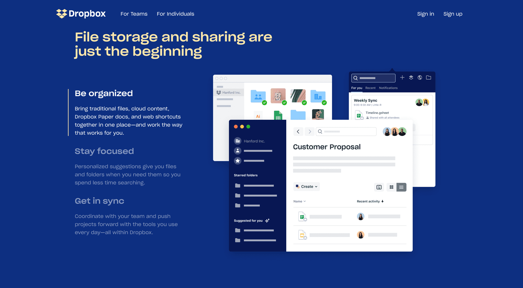 Dropbox is a powerful file storage tool with advanced features and the ability to sync files across programs and devices. It integrates with apps such as Slack, Zoom, HelloSign, and more. There are plan options for both individuals and teams, and it’s available for both desktop and mobile.