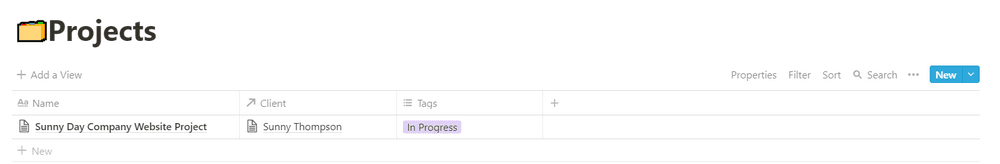 Now that you have a CRM, you can create another table as your Project Manager and link the two tables. This Projects table includes the fields Relation (Client) and Single Select (Tags).