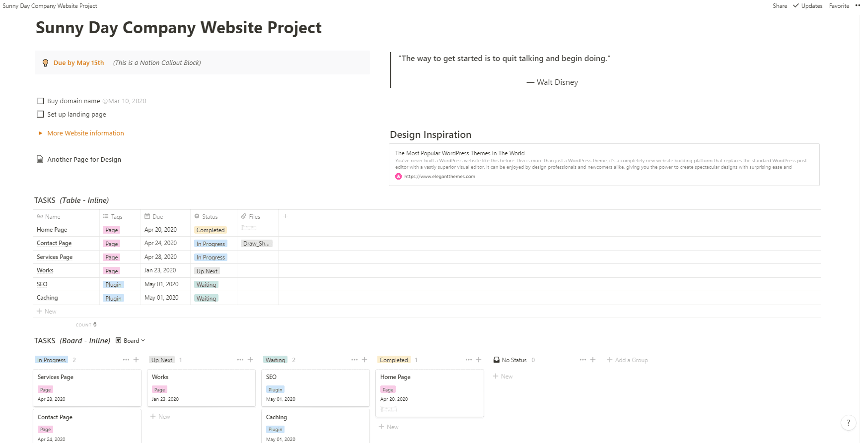 You can also embed any table inside any page. Here is a Project page from our Projects table. It has another table labeled Tasks embedded in the page in both Table view and in Board (Kanban) view.