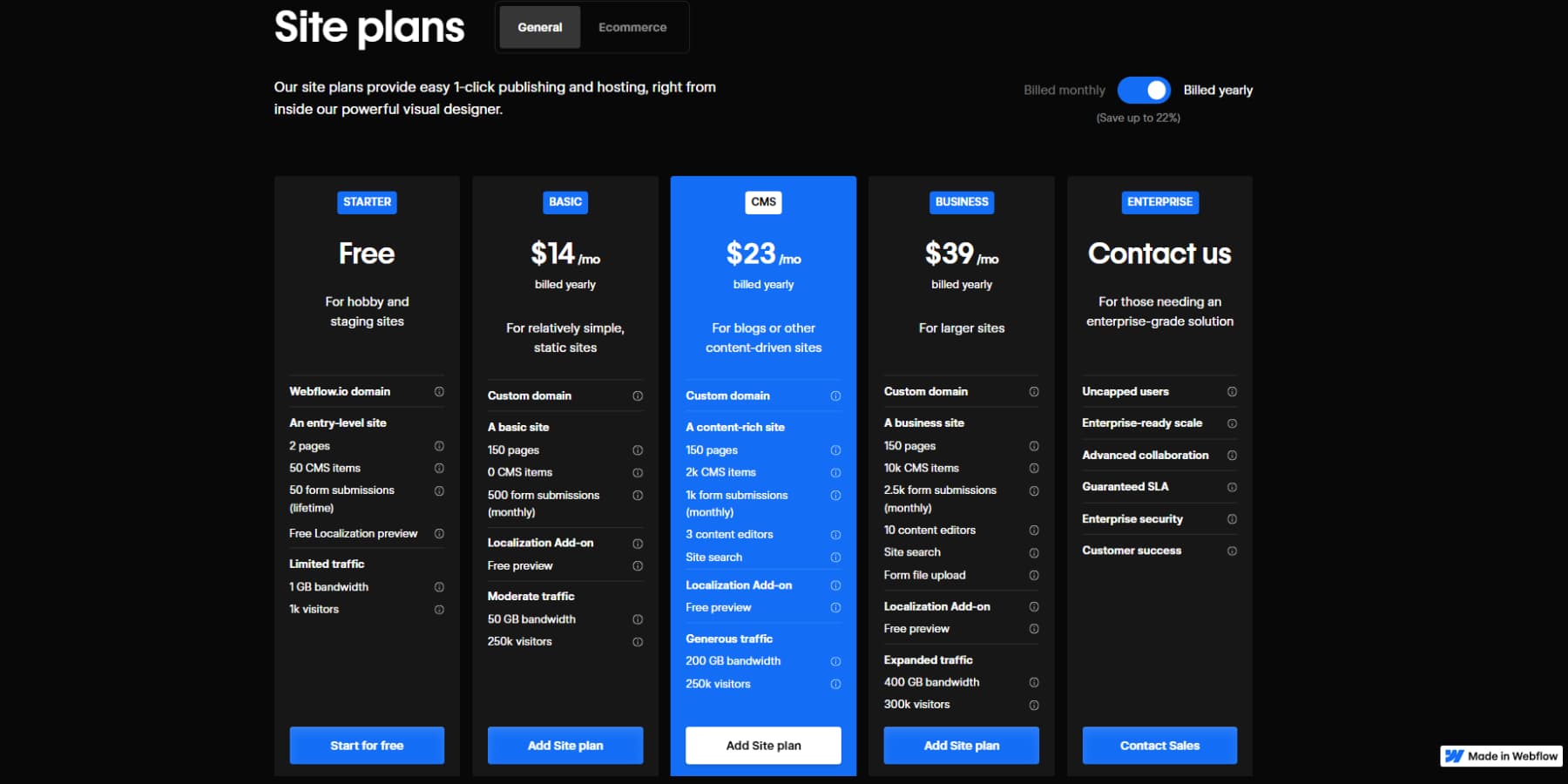 Let’s explore the pricing structure of Webflow. There are two types of Webflow pricing plans: General and eCommerce. Let’s start by exploring the General pricing: