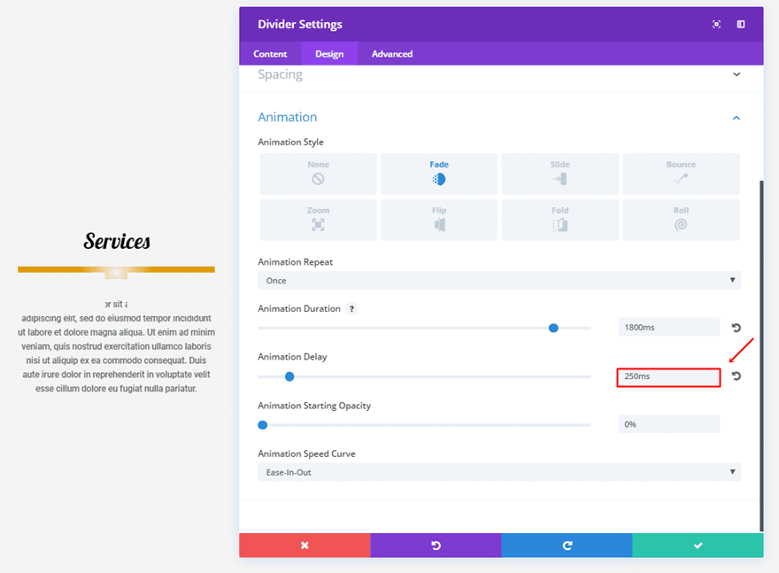 The animation delay you’ll need to add to the Animation subcategory of the last divider is ‘500ms’.