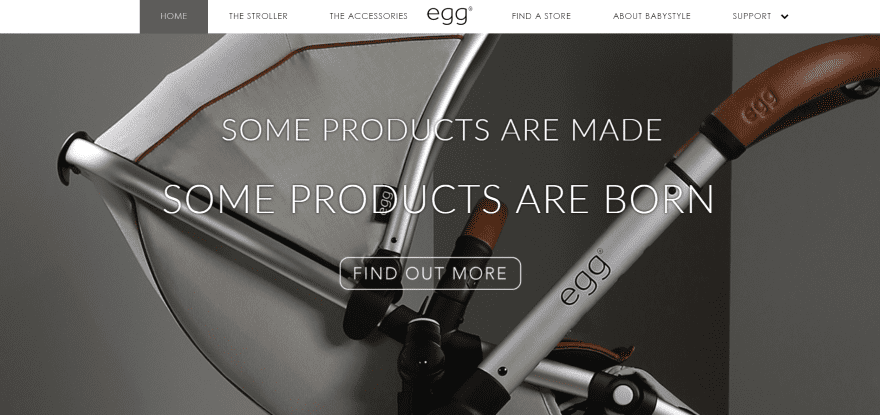 Egg Stroller uses a full-screen slider with tagline and CTA. The slider displays background images that slowly zoom out until the slide changes. The next section is full-screen and displays two columns with text with CTA’s and an image. Products are displayed in a full-width image slider followed by a footer and a strip with company logos. Products are displayed with WooCommerce. The store finder includes a location feature. The site makes great use of images and layout design.