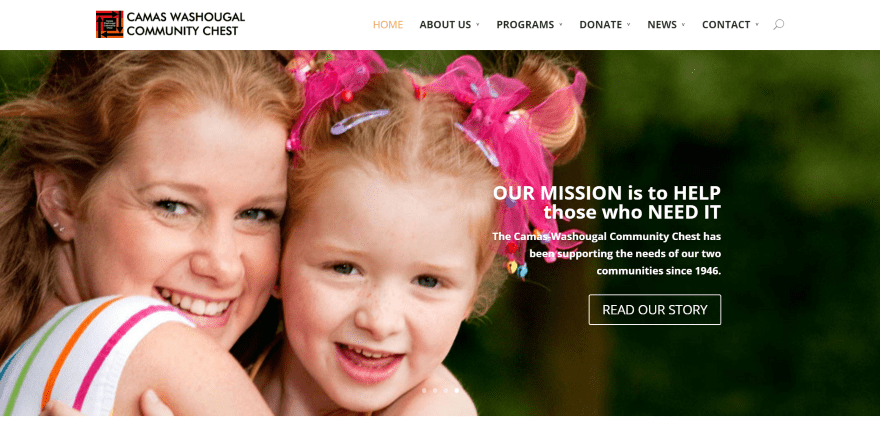 Camas Washougal Community Chest includes a full-screen image slider with mission statement and CTA. Scrolling reveals an about section with large block icons as links to various pages. Following this is an about section with CTA and footer – both using branded colored backgrounds. Forms are downloadable PDF’s. The site is simple and maintains a clean layout.
