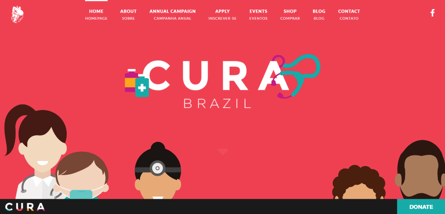 Cura Brazil displays a full-screen background image with logo in Flat Design colors. A CTA remains at the bottom of the screen and shows a logo and donate button that slowly changes color. Scrolling reveals a full-screen video with section styling, an about section with artistic use of true parallax and a CTA, a section with stats, a team section with a chart showing the number of team members by category, a styled section with application button, and subscription form. The site is a great example of using Flat Design and parallax usage.