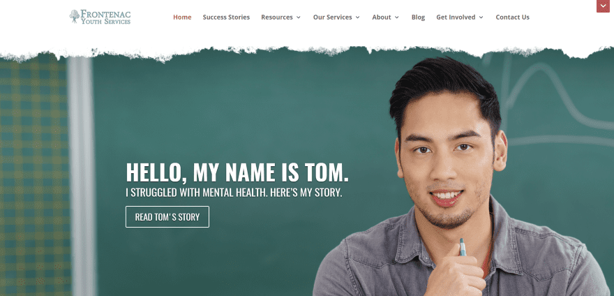 Frontenac Youth Services includes a full-screen image with CTA. The image has a torn look across the top, giving it a styled look. A message bar with contact info remains at the top of the screen and can be closed and opened by the reader. The next section uses stylized images with links to services. A two-column section displays a donation CTA and bar chart followed by a CTA in parallax and an overlay, and a blog section. The Success Stories page uses an interesting design with backgrounds and overlays. The background shows through for the title while the article uses an overlay. The articles are displayed with various column designs. The site makes great use of images, color, and backgrounds.