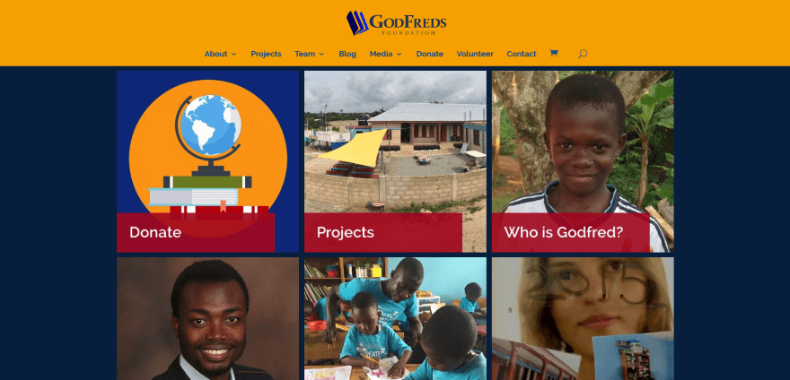 GodFreds Foundation displays a page grid with links to the various pages. Following this is a blog section, an embedded video, stats using circle counters, and a footer with links, search, and Facebook feeds. Donations are handled through a Total Donations form. The Volunteer page uses a two-column layout with an embedded WuFoo form and a styled FAQ column. The site design is simple and uses bold colors that match with the branding.