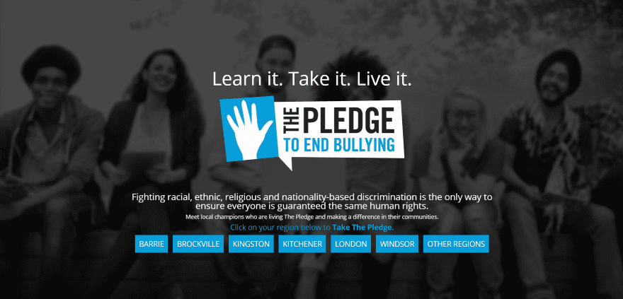 The Pledge To End Bullying has a full-screen image with overlay, logo, tagline, mission statement, and buttons for each of the regions that are covered. Scrolling reveals a section with sponsor logos and a two-column about section. It doesn’t include a menu or footer until you click on a region. The regional pages include an information section with embedded video, a signup form, stats, and lots of information. The top menu includes links.