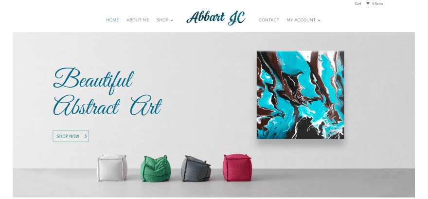 Abbart JC is a simple site that uses a boxed design with a narrow border. A full-screen CTA (call to action) draws visitors into the shop. The featured products section displays images for three product categories with hover animation and parallax. The shop pages also include hover animation and a styled back-to-top button. The shop is powered by WooCommerce.