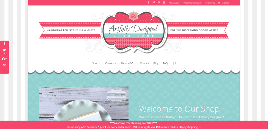 Artfully Designed Creations uses a boxed design with striped background an extra-large header and logo with styled section separator to create a curtained look. Sections include a post slider, featured products, latest products, and testimonials. The message bar at the bottom remains on screen on scroll. The red/pink and seafoam green work well with the site’s design.