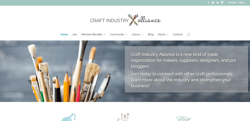 Craft Industry Alliance is a trade website for the crafting industry. It uses a full-width image with company information in a text module with reduced opacity. Scrolling reveals three blurb modules with custom icons and text. A slider provides information and links to read the magazine. It includes lots of integrated community areas including a forum, member’s only area, community groups, business directory, and lots more.
