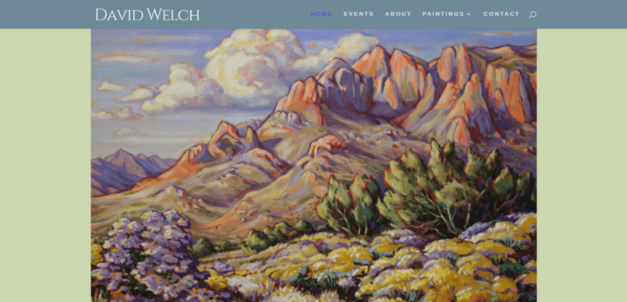 David Welch Art displays paintings in a full-screen image slider followed by social follow buttons and a full-width menu. The event calendar shows event locations and dates. The Paintings pages include an introduction to that type of media followed by the image gallery, which uses hover effects and opens in a lightbox using FooBox Image Lightbox. The site uses elegant fonts and colors.