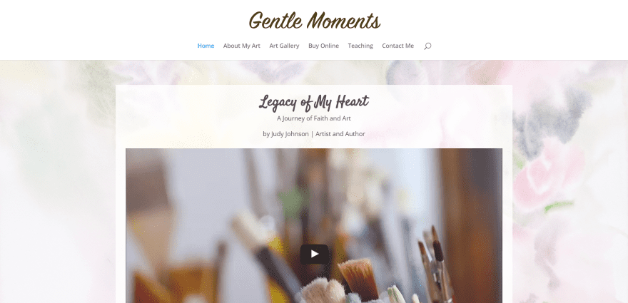 Gentle Moments Studio uses a boxed design with artistic background. The content is placed with a box with a slight reduction in opacity, allowing the background to peek through. The page includes an embedded video, a two-column CTA, a full-width image that works as a page sample which opens in a lightbox, a gallery grid, and about sections. The site uses elegant fonts and backgrounds.