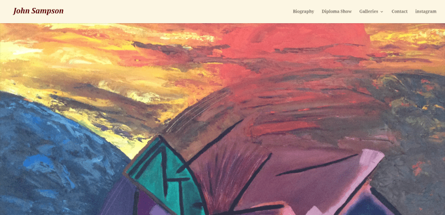 John Sampson Art use a full-screen image slider as a homepage. The site includes seven gallery pages – each page displaying a full-screen background header in parallax with a single page title. Work is displayed in a gallery grid with images opening in a lightbox. The biography page shows a schedule for events using headers for the dates with each separated by a line, creating a simple and interesting event’s calendar.