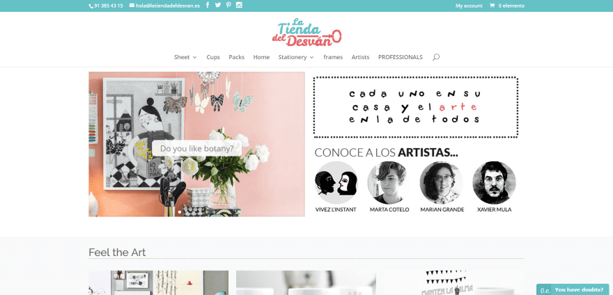 La Tienda Del Desvan uses a magazine design. The logo disappears on scroll, leaving the menu at the top of the screen. The first section includes a slider and links to the artists. Another section displays categories in a grid with a small subscription opt-in form. The shop section is powered by WooCommerce. Another section integrates artist’s photos into a CTA.