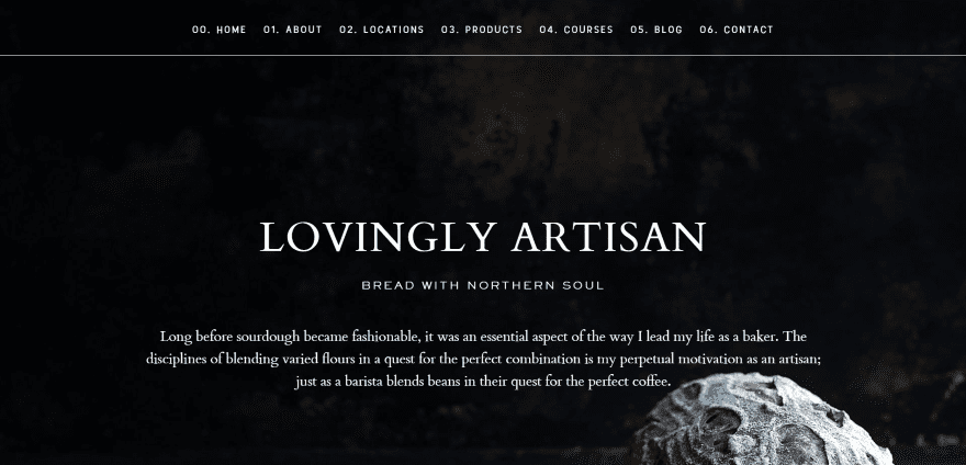 Lovingly Artisan displays a full-screen background with company name and quote. Following this is a two-column about section, a locations section in parallax, a section describing the products, links to courses, a blog section, contact form, and footer with the artisan’s signature. It uses a numbered menu structure with no logo. Each of the sections include the number to tie them with the menu. This is a Design Space design and all of the expected details are here. It makes great use of parallax and black and white.