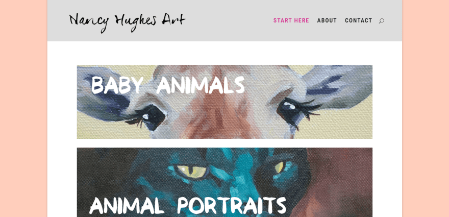 Nancy Hughes Art uses a boxed design with a soft background. The homepage displays images of artwork with category names as links to the various categories. Clicking on them opens a non-clickable image gallery in one or two columns (or combination of the two). The Contact page places the contact form over an artistic background and use multiple colors for the form fields. The fonts add to the artistic look of the site.