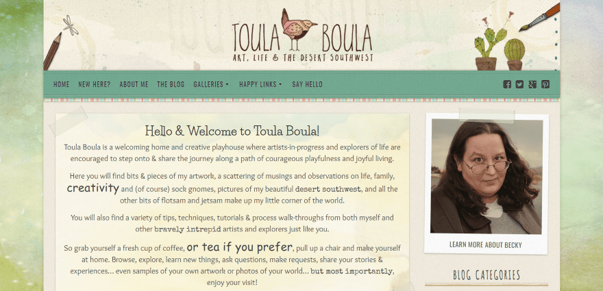 Toula Boula is an art blog that uses a boxed design with art background. Each of the design elements use details such as watercolor backgrounds and tape and staples holding the elements to the canvas. Links appear offset under the elements. The menu includes fonts within the navigation. The site is a single-column design with sidebar and includes a welcome and about section, post slider, subscription, samples of work, custom footer, and lots more. This is one of the most artistically designed sites on the list and makes great use of color, artwork, fonts, and details.