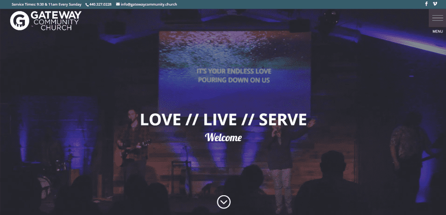 Gateway Community Church uses a full screen video and a right-side collapsible vertical menu. The layout includes an embedded event calendar with popups powered by EventOn. Giving takes you offsite to Easy Tithe. Ministry pages include toggles for schedules. The Messages page includes a series archive where you can listen to embedded audio. The non-scrolling map includes service times. The site makes great use of color, images, and fonts.