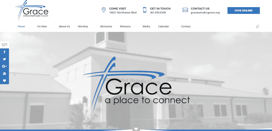 Grace United Methodist Church has an elegant layout that’s similar to a magazine design with links to all of the relevant pages. It includes a full screen image, section separations, and hover animations. The top menu includes contact info and a giving CTA that’s powered by eServicePayments. Newsletters are provided as PDF downloads. Sermons are provided as embedded video. Events are displayed using All in One Event Calendar. The site makes great use of color and images.