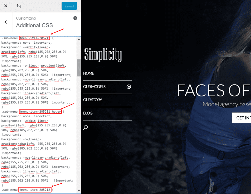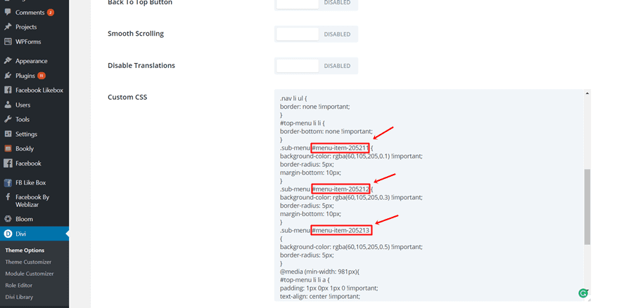 Replace the following CSS IDs in the code with the ones that apply to your sub menu. In the previous step of this post, we’ve shown you where you can find those.
