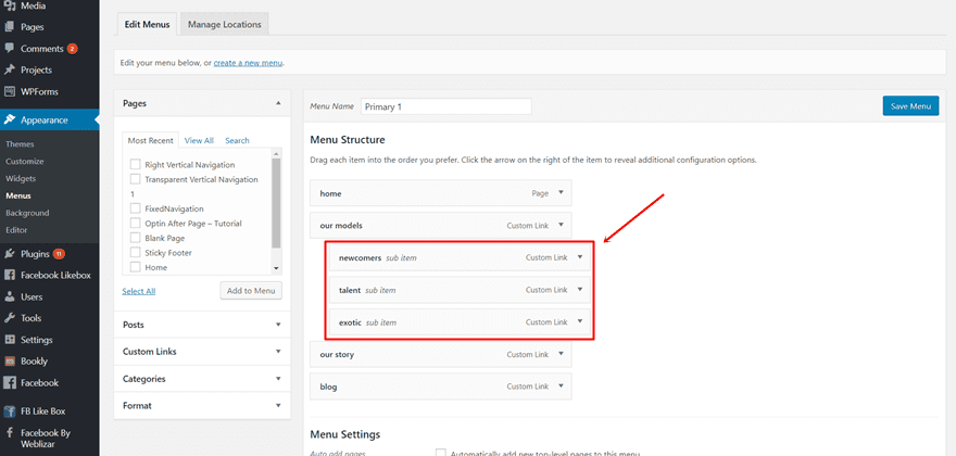 If you’re on your WordPress Dashboard, go to Appearance > Menus. If you have already created a menu, use that one. If not, start by making a new menu. Then, add the main menu items to your menu. Once you’ve done that, you can add the sub menu items. Add a sub menu item and simply just put it right under the primary menu item. Do this for all the sub menu items you’d like to add to your vertical navigation.