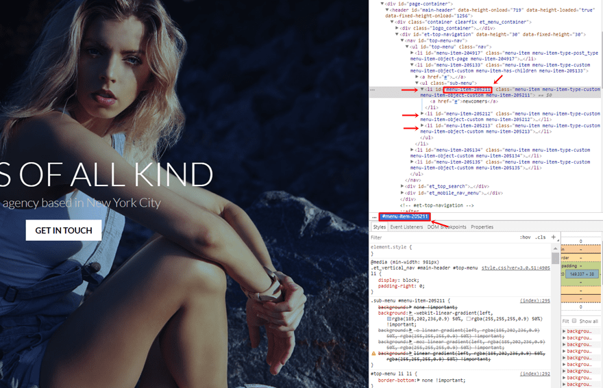 Go to your homepage, put your mouse on the menu and start inspecting the code. You’ll see the CSS ID appear on the menu item that’s selected. Copy each one of the CSS IDs in the sub menu list and save them for later.
