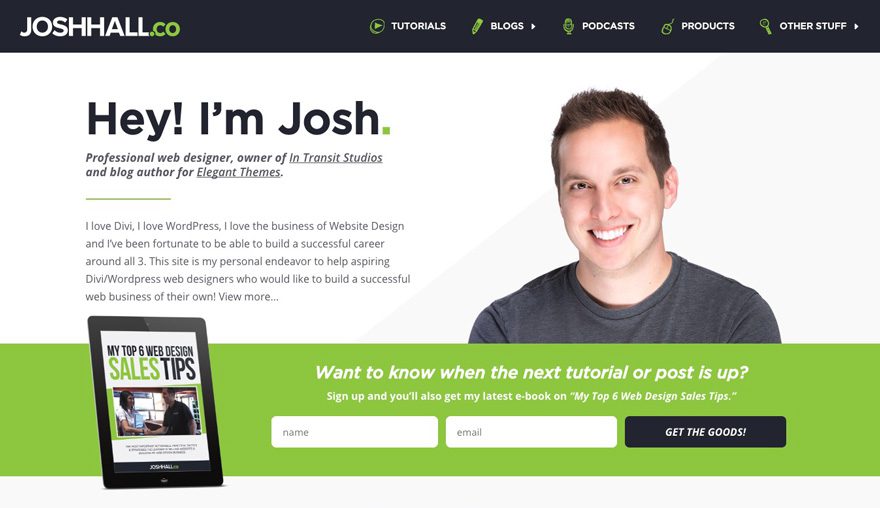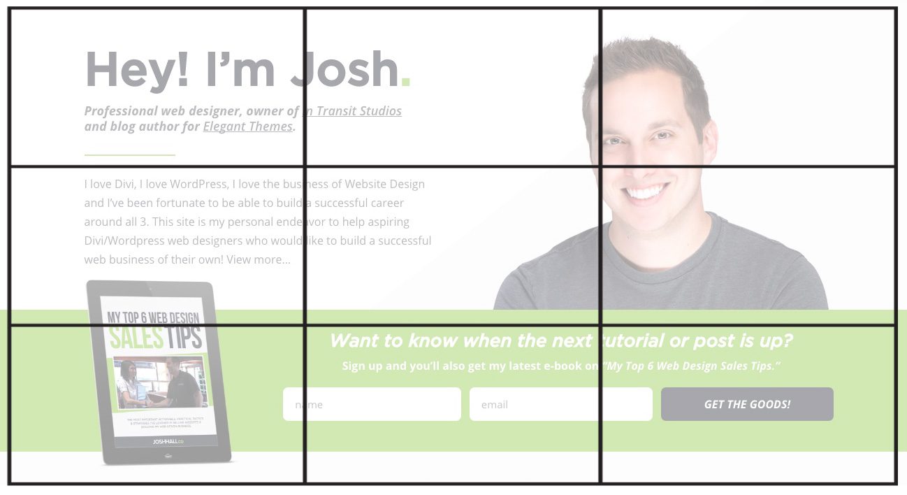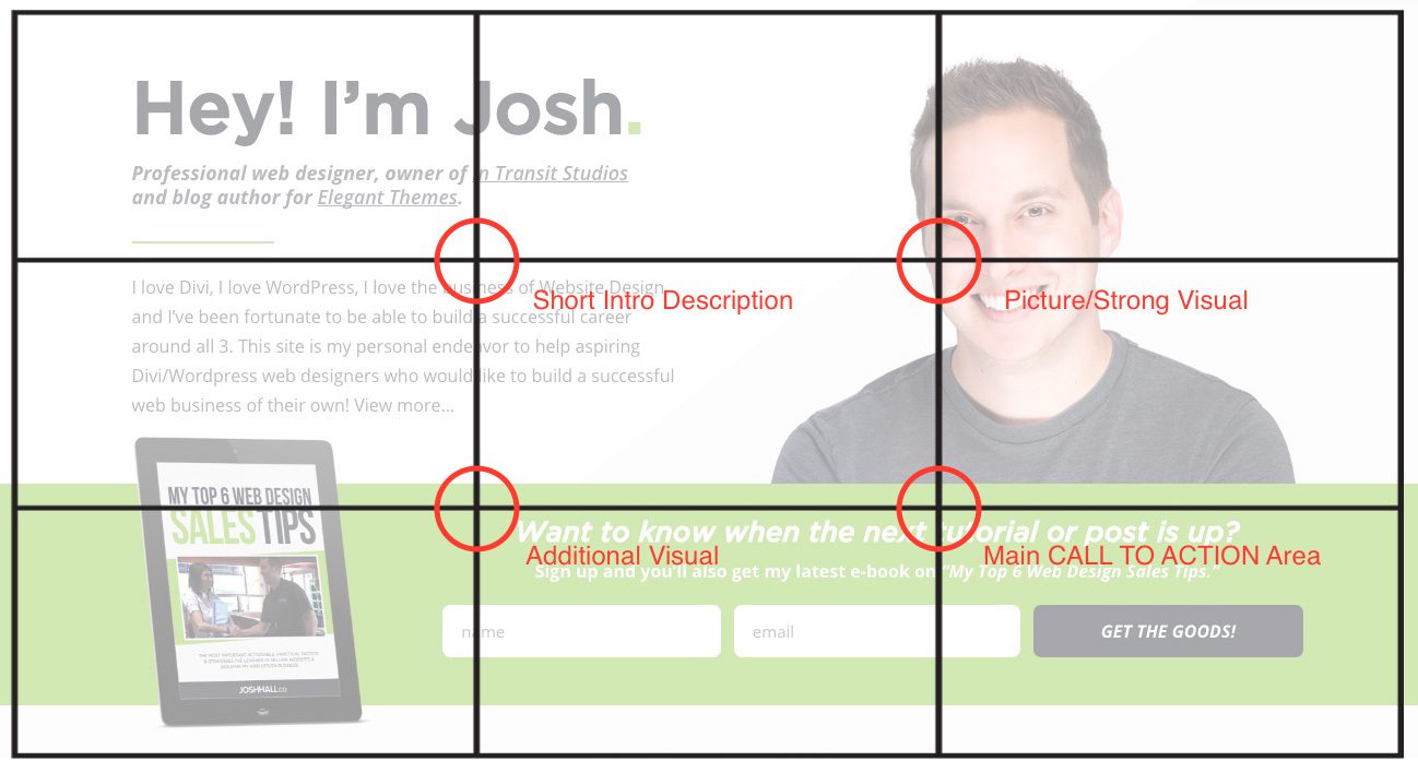 You can see a big difference in regards to how the eye-pleasing designs will often line up with one or more of the intersection points. While the Rule of Thirds is most commonly talked about in photography and videography, it’s equally as important for website design. I’ll show you how I applied the rule of thirds to my personal site. Here’s a snapshot of the initial design “above the fold,” which applies to what the viewer sees before scrolling down.