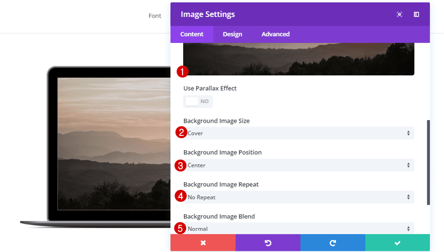 Then, open the Background subcategory within the Content tab and add a background image with the following settings:
